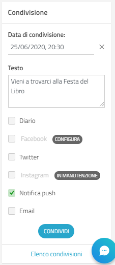 Adesso non devi fare altro che inserire la data e l’ora in cui vuoi condividere la tua informazione, puoi inserire un’ulteriore testo a corredo dell’informativa, selezionare "Notifica push"e cliccare su “CONDIVIDI”. A questo punto non ti rimane altro che cliccare su “Procedi” se vuoi far si che la programmazione sia registrata.