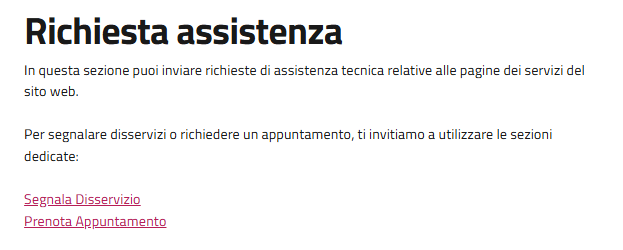 “In questa sezione puoi inviare richieste di assistenza tecnica relative alle pagine dei servizi del sito web.Per segnalare disservizi o richiedere un appuntamento, ti invitiamo a utilizzare le sezioni dedicate."