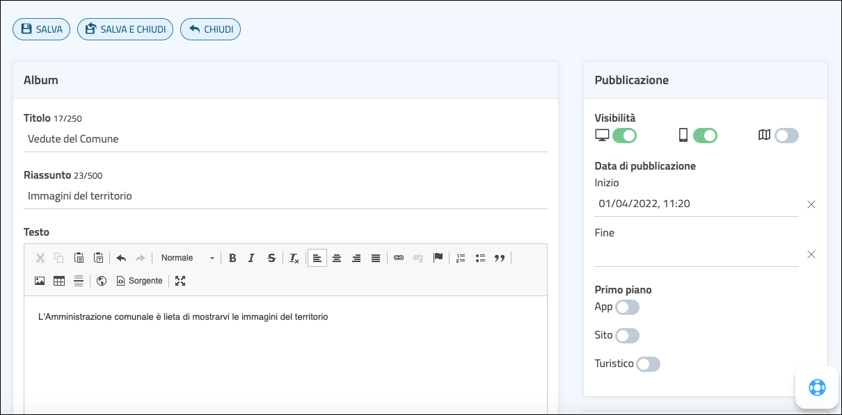 4. Ora clicca su "Salva". Come per le Notizie, gli Eventi e tutti gli altri contenuti, il primo salvataggio ti consentirà di sbloccare altre funzionalità ed inserire ulteriori informazioni: un'immagine principale che sarà la copertina dell'album, campi aggiuntivi, documenti allegati, mappe (punti d'interesse) e contenuti correlati.