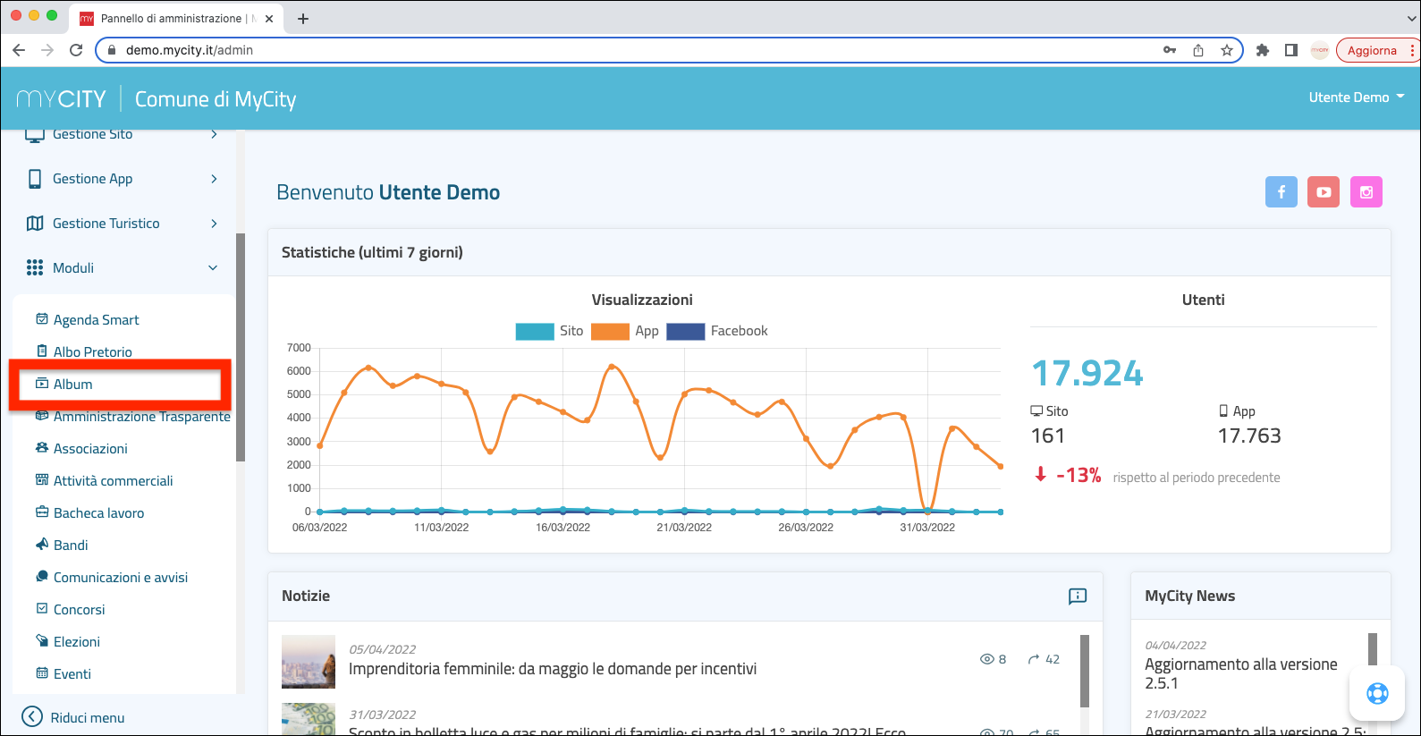 1. Dopo aver effettuato l'accesso con le tue credenziali al Pannello di Controllo di MyCity, clicca su "Moduli" e seleziona "Album". Se non riesci a vedere tale modulo, probabilmente devi richiedere ad un utente Admin di attribuirti i permessi specifici.