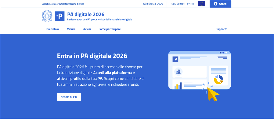 La registrazione su PA Digitale 2026, il portale dedicato all'attuazione di queste misure, è il primo passaggio da effettuare per poter partecipare agli avvisi e richiedere i finanziamenti per la transizione digitale: ecco come fare!
