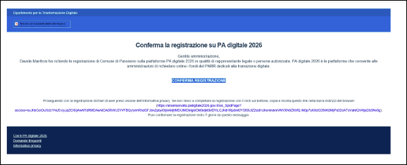 4. All'indirizzo PEC primario del Comune indicato su IPA verrà inviata un'email per confermare la registrazione. Clicca sul link o copialo e incollalo nella barra degli indirizzi.
