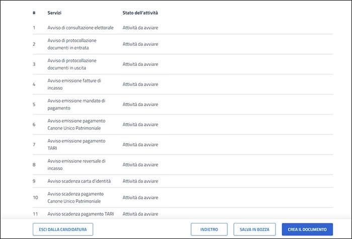 - Servizi che non hai ancora censito su app IO: in questo caso, indica come stato dell'attività "Attività da avviare"