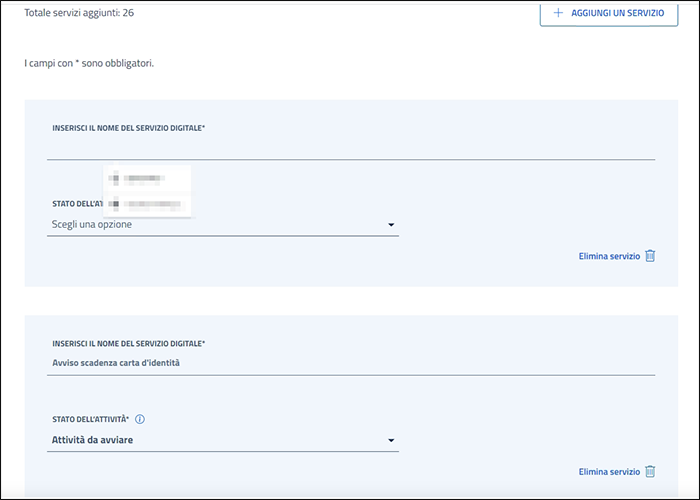 È necessario indicare ogni servizio per cui si richiede il finanziamento al momento della presentazione della domanda. Per aggiungere un servizio, clicca sul pulsante "Aggiungi un servizio" in alto a destra e inserisci il nome del servizio digitale, ad esempio "Avviso scadenza carta d'identità".