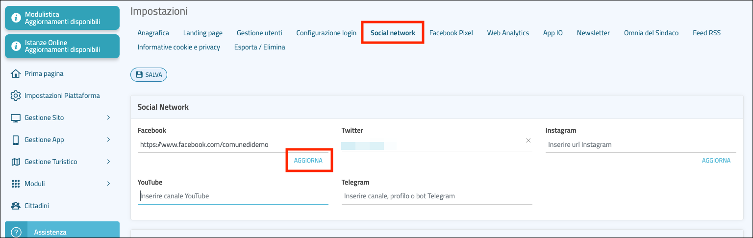 3. Nel campo Facebook inserisci il link della tua pagina Facebook e poi clicca su "Aggiorna".