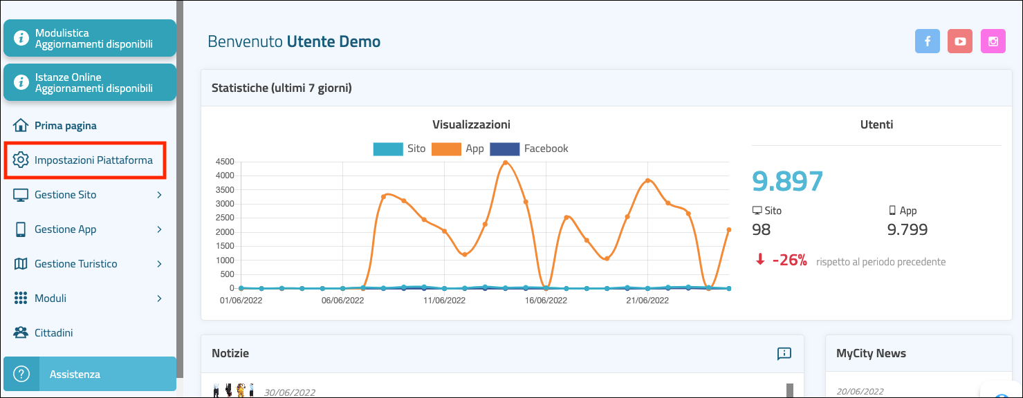 1. Accedi al Pannello di controllo con le tue credenziali e clicca su "Impostazioni piattaforma". Se non riesci a vedere questa sezione, probabilmente devi richiedere ad un utente Admin di attribuirti i permessi specifici.
