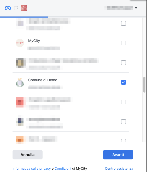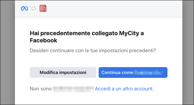 5. A questo punto ti verrà chiesto di accedere a Facebook e dovrai inserire le credenziali di un utente amministratore della pagina. Se hai già collegato MyCity a Facebook, clicca sul pulsante "Continua come...".