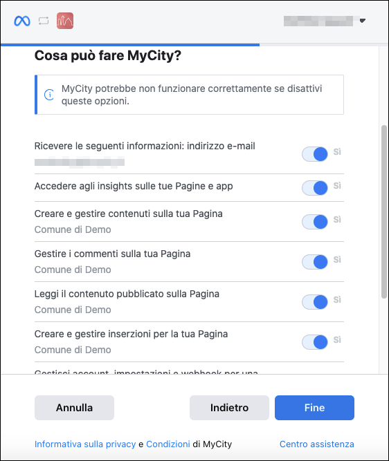 6. Nella pagina "Cosa può fare MyCity?" abilita tutte le voci e clicca su "Fine".
