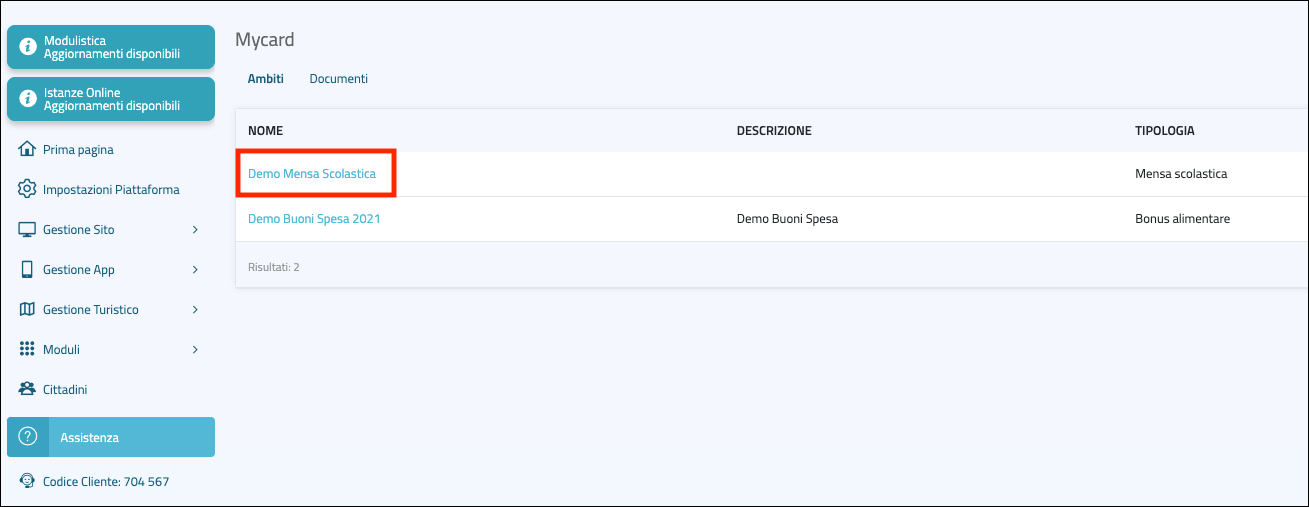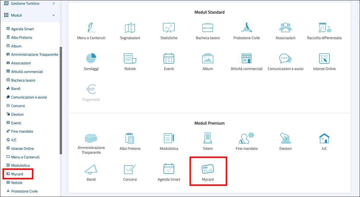 1. Dopo aver effettuato l'accesso con le tue credenziali al Pannello di Controllo di MyCity, clicca su "Moduli" (oppure scorri in fondo alla Homepage) e seleziona "MyCard". Se non riesci a vedere tale modulo, probabilmente devi richiedere ad un utente Admin di attribuirti i permessi specifici.