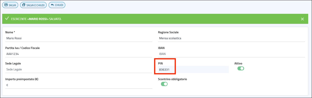 L'unico campo obbligatorio è il nome. Per generare il PIN, clicca su "Salva" e si genererà automaticamente il codice di sei cifre. Trasmettilo all'esercente, gli servirà per registrare le transazioni e visualizzare i propri rimborsi!