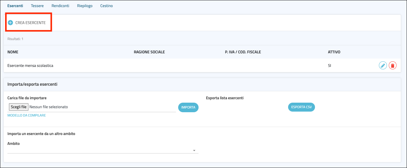 3. Non appena avrai cliccato sull'ambito, ti troverai nella sezione dedicata alla creazione e gestione degli Esercenti. Se gli esercenti non sono molti, ti consigliamo di crearli manualmente.
