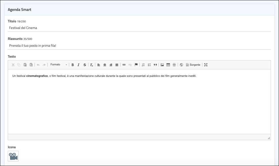 2. Inserisci il nome, ad esempio “Festival del Cinema” e, se vuoi, un riassunto, un testo o un’icona.