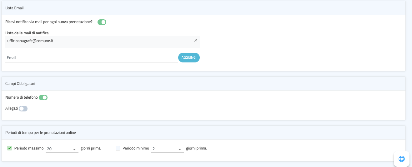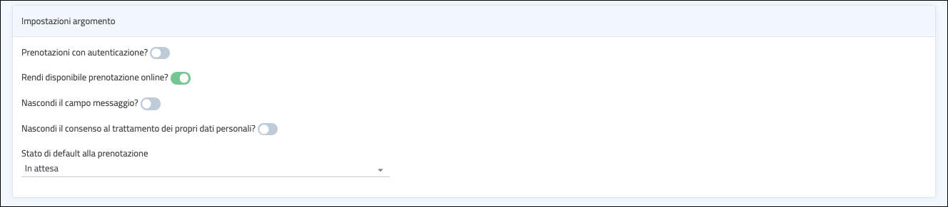 - Puoi nascondere anche il consenso al trattamento dei dati personali; se non attivi questo pulsante, i Cittadini dovranno accettare il trattamento dei dati personali al momento dell'invio della prenotazione.