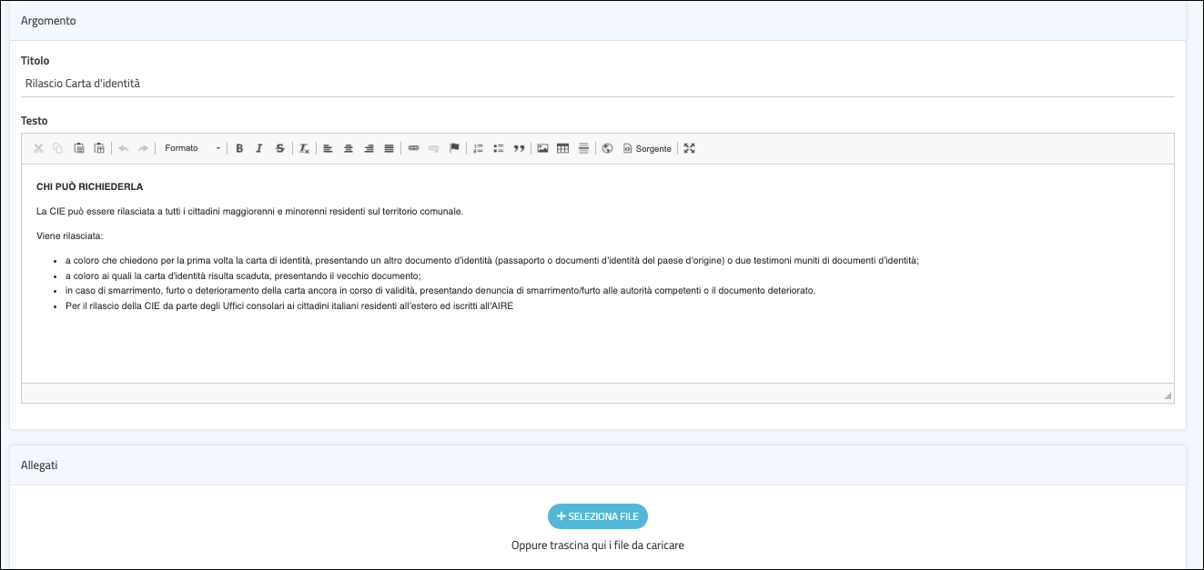 3. Inserisci il titolo del servizio prenotabile, come “Rilascio Carta d’identità”. Puoi inserire anche un testo descrittivo, spiegando ad esempio chi può accedere al servizio e allegare dei documenti che è necessario portare con sé all’appuntamento.