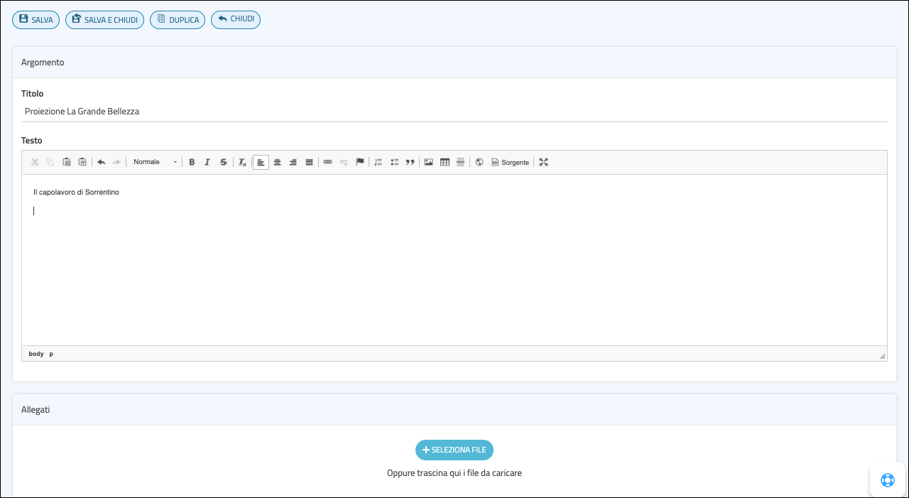 3. Inserisci il titolo dell’evento prenotabile, come “Proiezione La Grande Bellezza”. Puoi inserire anche un testo descrittivo, spiegando ad esempio la trama del film o inserendo il link al trailer. Puoi anche inserire degli allegati, come la locandina dell'evento.