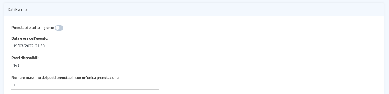 4. Definisci le caratteristiche dell’evento: se attivi il bottone “Prenotabile tutto il giorno”, sarà possibile prenotare un posto anche dopo che il film è iniziato.