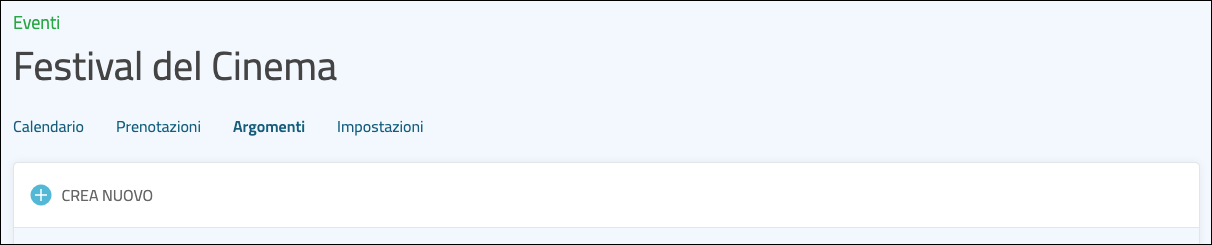 Un argomento è un servizio che rendi disponibile ai Cittadini per la prenotazione. Nel caso dell'Agenda Eventi potrebbe trattarsi di un Festival teatrale, una rassegna cinematografica o un ciclo di conferenze.