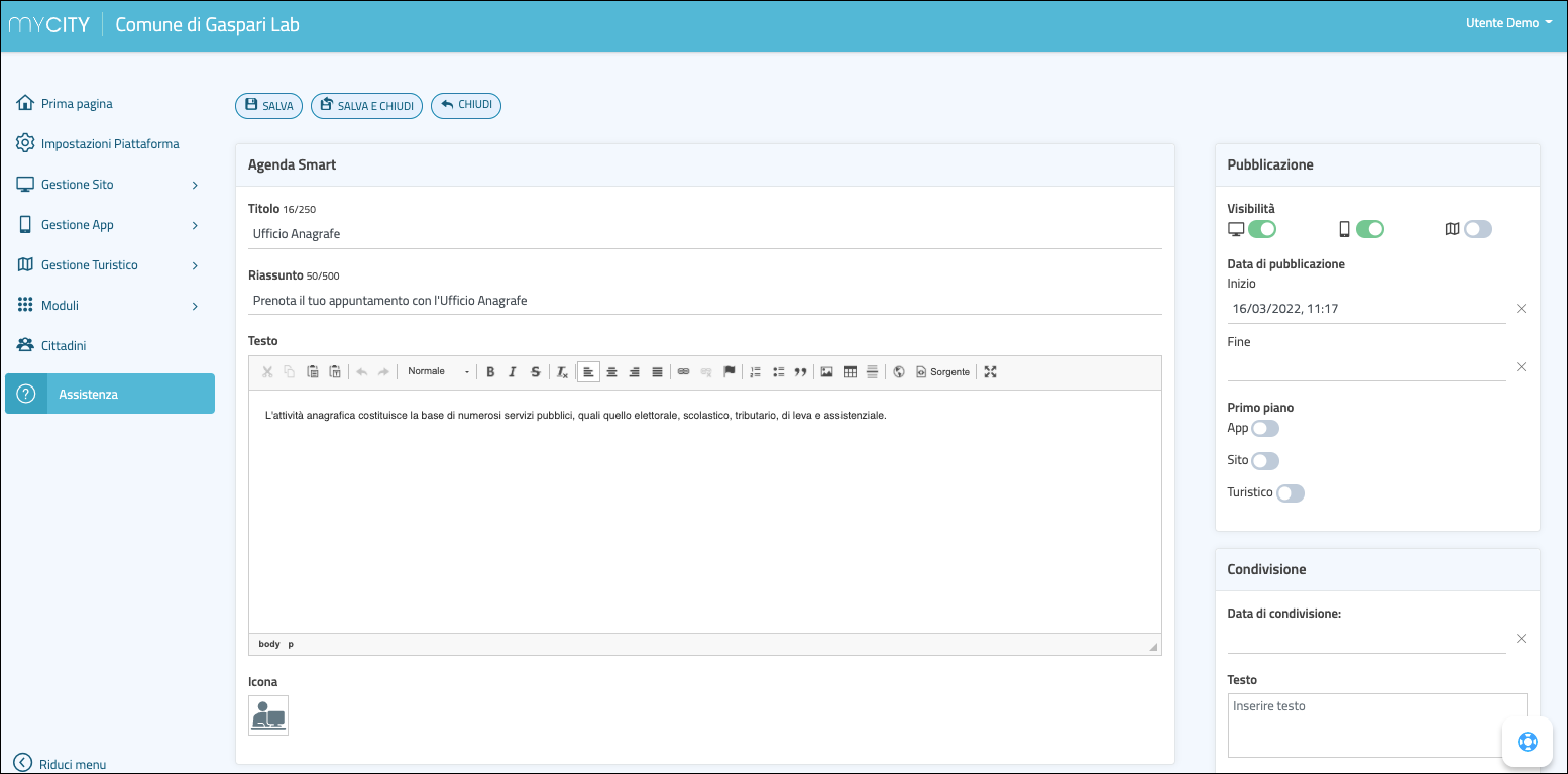 Inserisci il nome dell’ufficio e, se vuoi, un riassunto, un testo e un’icona. Nel testo potresti inserire i servizi offerti, link a documenti o istanze e tutte le informazioni utili allo svolgimento delle pratiche amministrative.