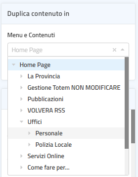 Vuoi duplicare un contenuto, evento o notizia già esistente? Niente di più facile basta recarti nel contenuto che intendi duplicare, andare nella sezione "Duplica contenuto in" e selezionare il punto menù nel quale duplicare il contenuto.