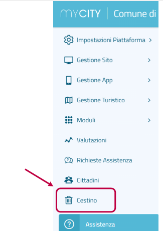 Per trovare il Cestino devi accedere al pannello di amministrazione e andare sulla colonna di sinistra: lo trovi in fondo alla colonna, vicino alla voce "Assistenza".