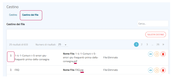È diviso in due sezioni "Cestino" e "Cestino dei file".