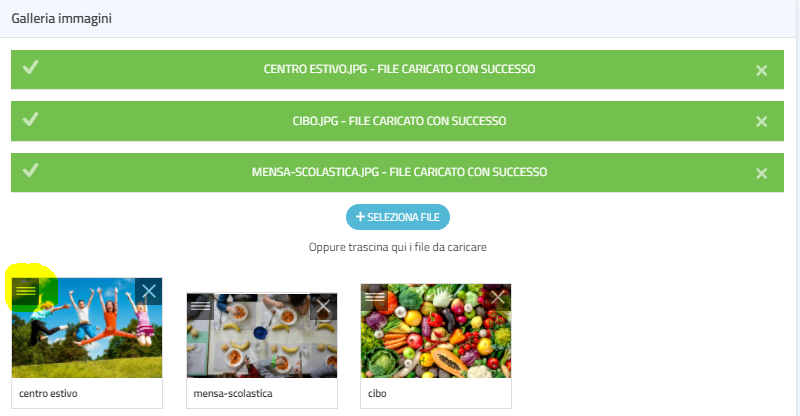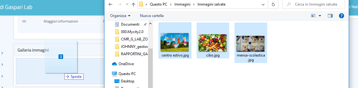 Vuoi inserire delle immagini in una notizia, contenuto od evento? Niente di più facile, devi andare nella sezione "Galleria immagini", clicca su "SELEZIONA FILE" e vai nel percorso che contiene le immagini da allegare, adesso selezionale e clicca su Apri oppure puoi trascinarli all'interno della sezione dedicata.