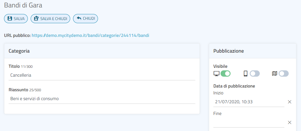In "Titolo" inserisci il nome della categoria di bando, ad esempio "Cancelleria".
