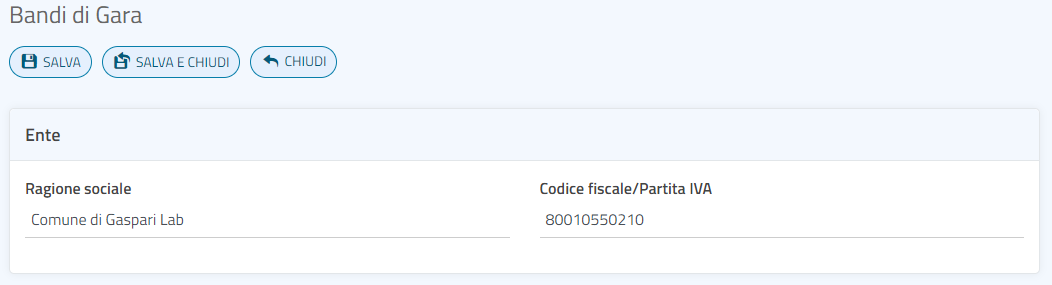 In "Ragione sociale" vai ad inserire il nome dell'Ente, ad esempio "Comune di Gaspari Lab".