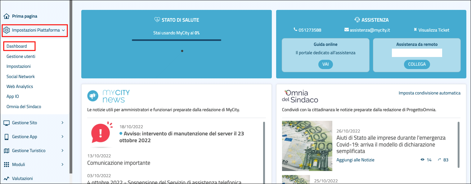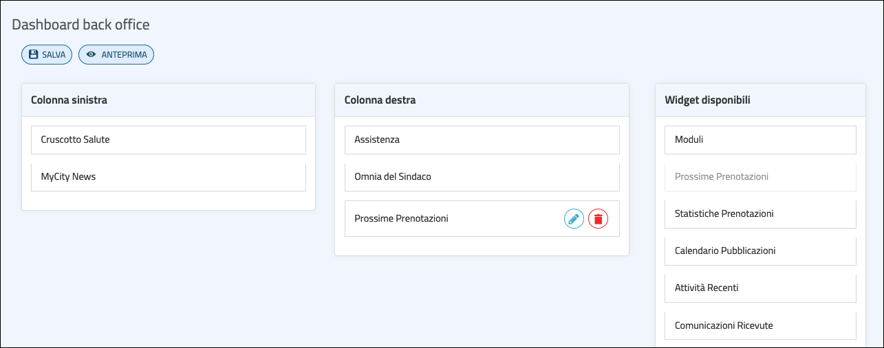 Ogni utente che accede al Pannello di controllo ha necessità diverse: gestire le prenotazioni o le istanze, programmare la pubblicazione delle notizie, rispondere alle segnalazioni dei Cittadini... Per questo, abbiamo reso possibile personalizzare la dashboard, l'homepage del Pannello di controllo. Con due semplicissimi passaggi, avrai sempre a portata di mano tutte le funzionalità che usi di più.