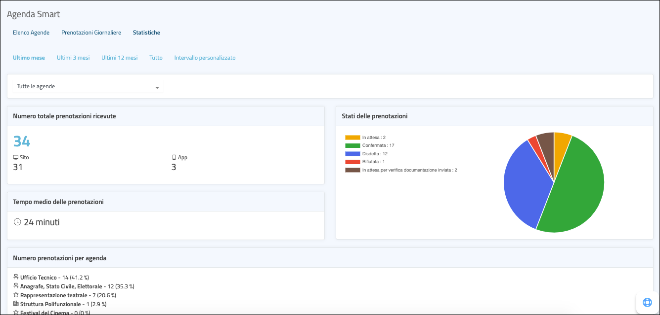 Nella sezione dedicata alle statistiche, puoi consultare i dati relativi al numero di prenotazioni effettuate per ogni ufficio, servizio, struttura o evento, oltre alla durata media degli appuntamenti e ad altri dati utili per monitorare e rendere sempre più efficiente il servizio offerto ai Cittadini.